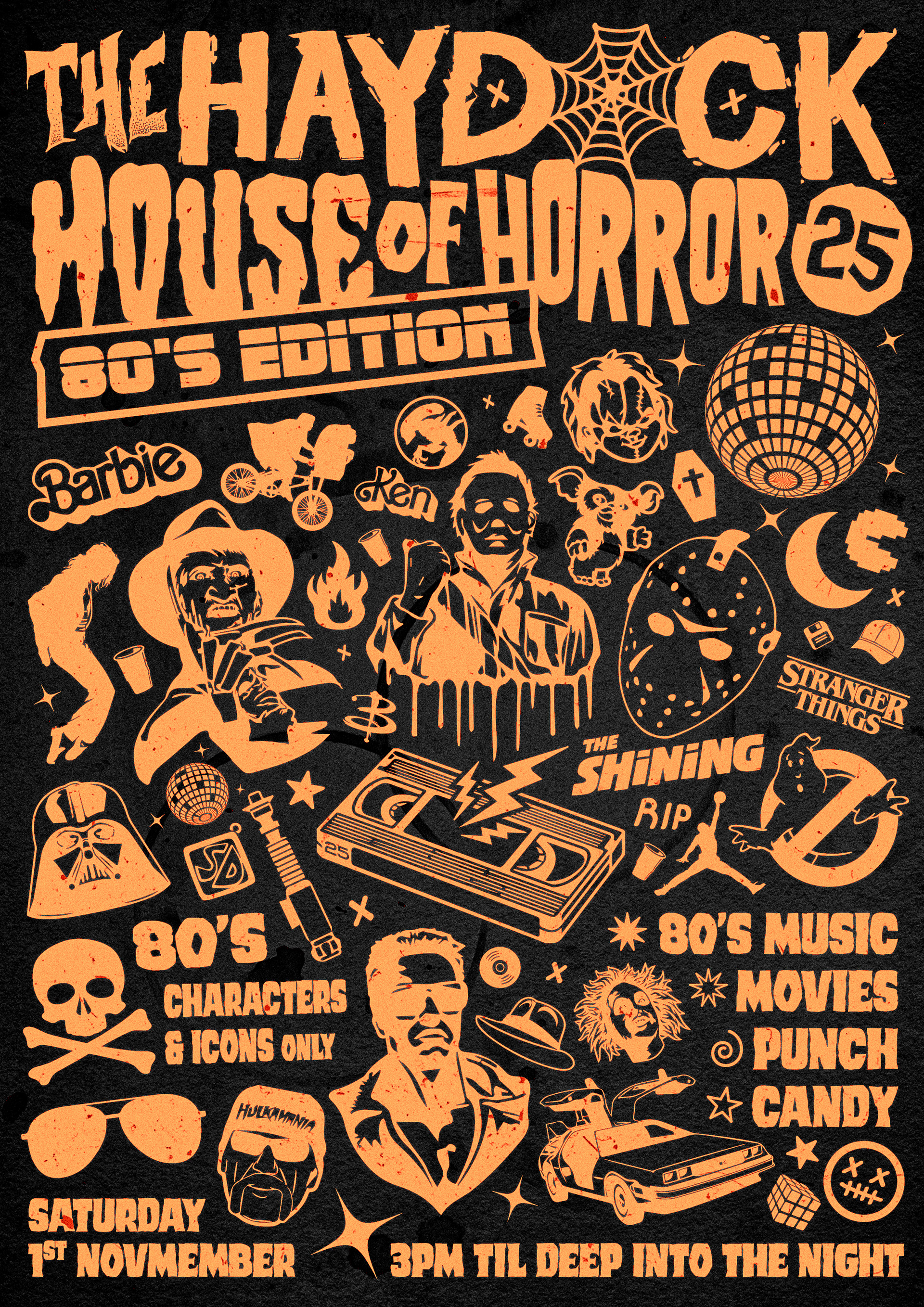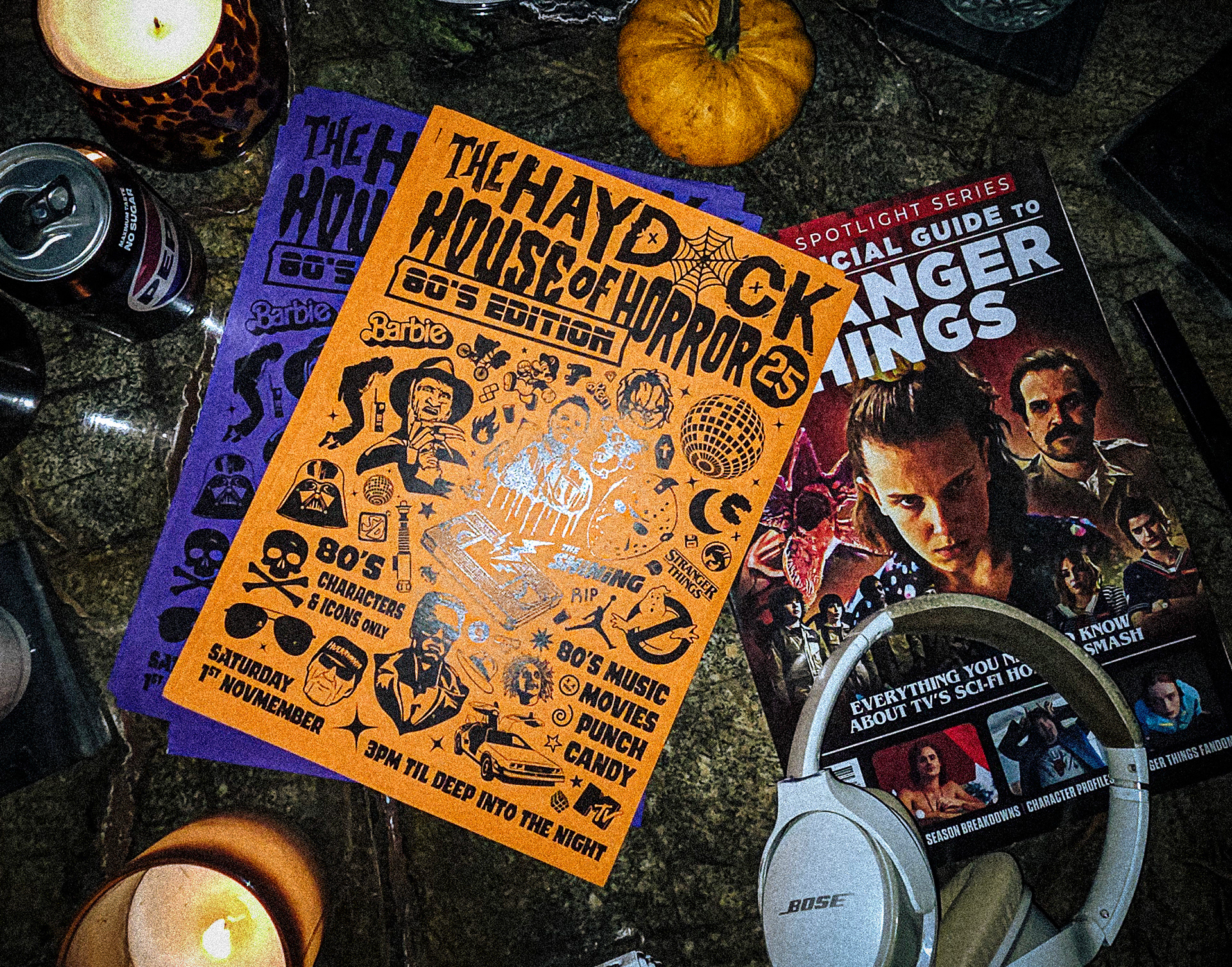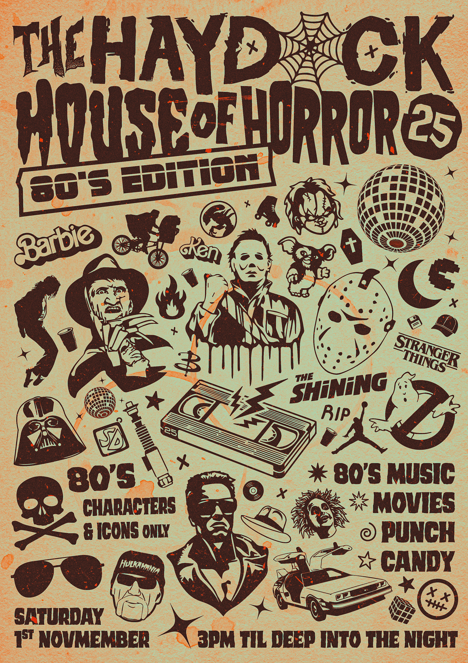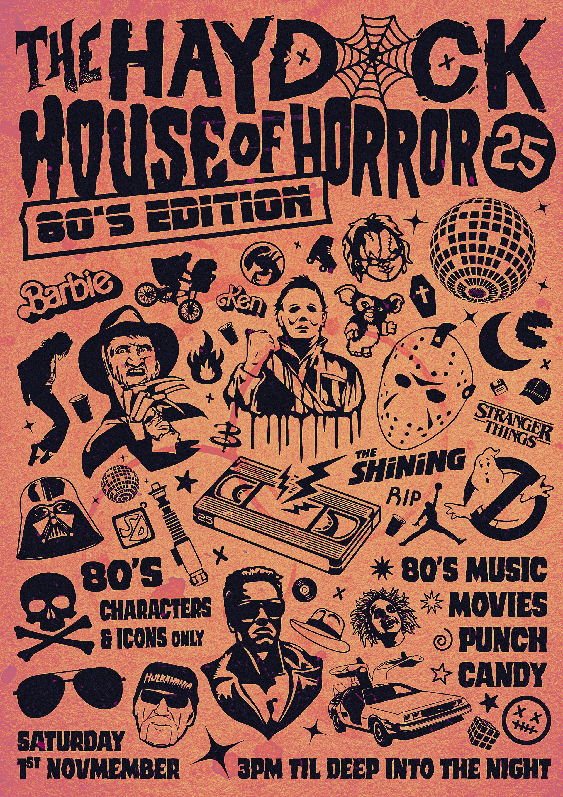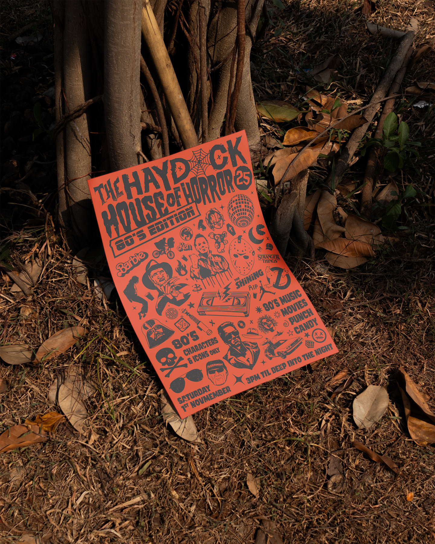 I made this as a fun invite for everyone coming along, leaning fully into an 80s Halloween vibe. It’s stacked with iconic characters and little references, printed on orange paper as a throwback to old school party flyers. The idea was to keep it loose and nostalgic, something that feels more like a flyer you’d find back in the day than a polished poster.